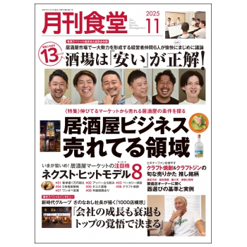 - 《特集》伸びてるマーケットから売れる居酒屋の条件を探る 居酒屋ビジネス売れてる領域 食材の原価高騰や最低賃金の引き上げによる人件費の上昇、若年層のアルコール離れ、さらにはコロナ禍に顕在化した消費者の生活様式の変化。居酒屋の経営環境が厳しさを増す一方で、消費者の酒を飲むシーンも変容していることは想像に難くありません。巻頭スペシャル座談会に登場する居酒屋経営者6人の格安酒場チェーンは、そうした消費者の潜在需要をいち早くキャッチして急成長を遂げた好例といえます。11月号は居酒屋市場の中で「当ててる人、店、商品」にフォーカス。伸びてるマーケットから売れる居酒屋の条件を探ります。